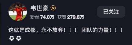 hth-韦世豪社媒庆祝赢球:这就是成都,永不放弃,团队的力量